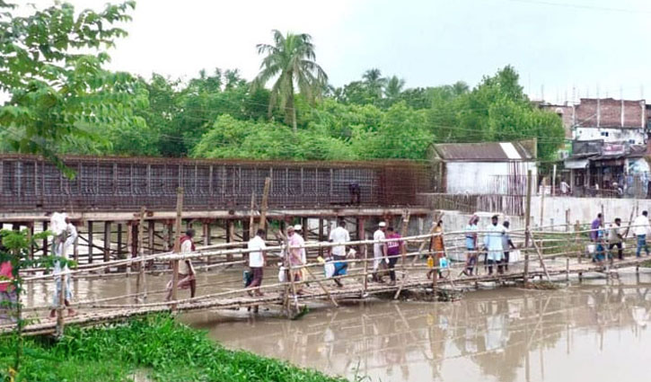 সরেজমিন দেখা যায়, এতদিনে কাজের অর্ধেকও শেষ হয়নি। প্রতিদিন দুই-তিনজন শ্রমিক দিয়ে গড়িমসি করে কাজ চালানোর অভিযোগ তুলেছেন স্থানীয়রা। সকালে কাজ হলে বিকালে বন্ধ থাকে, আবার বিকালে শুরু হলে সকালে থাকে না। বছরের পর বছর ধরে এভাবে চলায় এলাকার মানুষকে বিকল্প ব্যবস্থা হিসেবে ঝুঁকিপূর্ণ বাঁশের সাঁকো ব্যবহার করতে হচ্ছে।