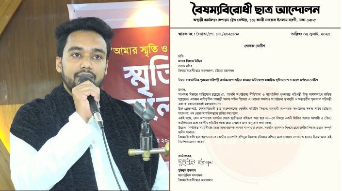 সংগঠনের কেন্দ্রীয় সভাপতি রশিদুল ইসলাম রিফাত ও সাধারণ সম্পাদক হাসান ইনামের পক্ষে সাংগঠনিক সম্পাদক মুঈনুল ইসলাম স্বাক্ষরিত এ নোটিশে আরও উল্লেখ করা হয়, নির্ধারিত সময়ের মধ্যে সন্তোষজনক জবাব না পেলে তাঁর বিরুদ্ধে পরবর্তী সাংগঠনিক ব্যবস্থা নেওয়া হবে।